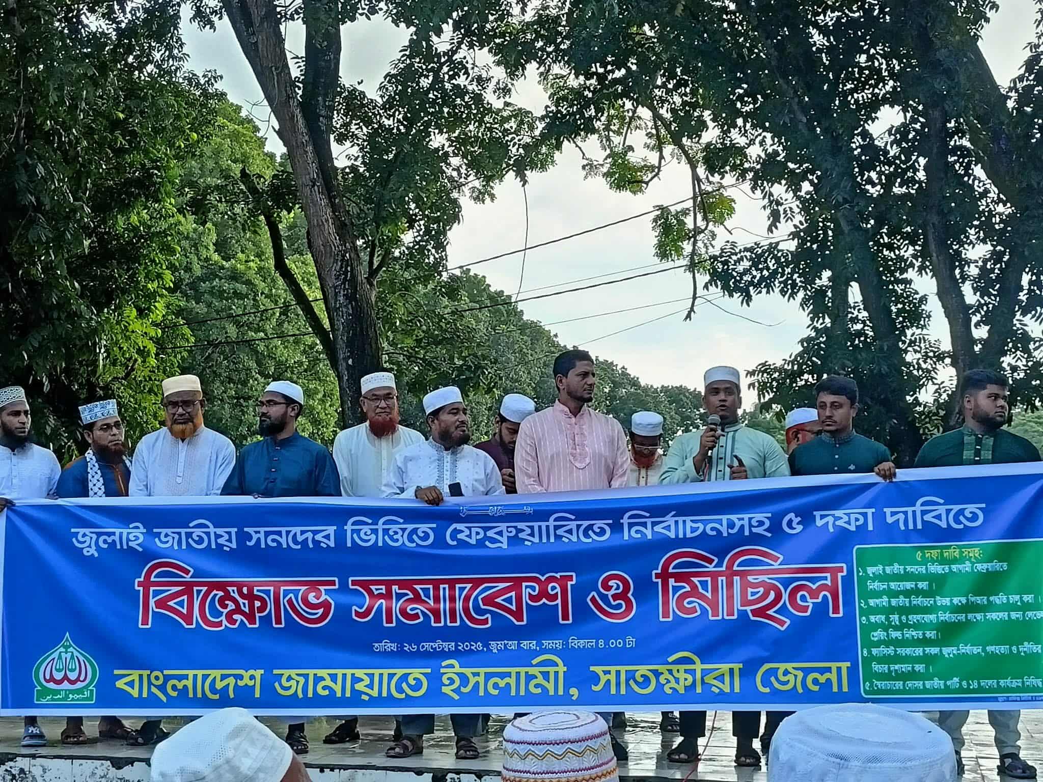 জুলাই জাতীয় সনদের ভিত্তিতে আগামী ফেব্রুয়ারিতে জাতীয় নির্বাচন আয়োজনসহ পাঁচ দফা দাবিতে বিক্ষোভ কর্মসূচি পালন করেছে বাংলাদেশ জামায়াতে ইসলামী সাতক্ষীরা সদর শাখা। শুক্রবার (২৬ সেপ্টেম্বর) বিকেল সাড়ে ৪টার দিকে শহীদ আব্দুর রাজ্জাক পার্ক থেকে একটি বিক্ষোভ মিছিল বের হয়। এর আগে সেখানে এক প্রতিবাদী সমাবেশ করে দলটি। সমাবেশ ও মিছিলে জেলা ও উপজেলা জামায়াতে ইসলামের হাজারো নেতাকর্মী ও সাধারণ মানুষ অংশ নেন। প্রতিবাদী সমাবেশে বক্তব্য রাখেন জামায়াতের কেন্দ্রীয় সাংগঠনিক সেক্রেটারি মুহাদ্দিস আব্দুল খালেক, জেলা আমির উপাধ্যক্ষ শহিদুল ইসলাম মুকুল, জেলা সেক্রেটারি মাওলানা আজিজুর রহমান, সহকারী সেক্রেটারি সহযোগী অধ্যাপক ওবায়দুল্লাহ, অফিস সেক্রেটারি মাওলানা রুহুল আমিন, শহর আমির জাহিদুল ইসলাম, সদর আমির মাওলানা মোশারফ হোসেন, শহর সেক্রেটারি খোরশেদ আলম, সদর সেক্রেটারি হাবিবুর রহমানসহ স্থানীয় নেতৃবৃন্দ। বিএনপির দিকে ইঙ্গিত করে জামায়াতের সাংগঠনিক সেক্রেটারি মুহাদ্দিস আব্দুল খালেক বলেন, “অন্তর্বর্তী সরকার এখনই একটি দলকে বিশেষ সুবিধা দেওয়ার চেষ্টা করছে। আমরা এর তীব্র প্রতিবাদ জানাই। আমরা সরকারকে বলতে চাই—ঢাকা বিশ্ববিদ্যালয়ের মেধাবী ছাত্রসমাজ ইতোমধ্যেই জানিয়ে দিয়েছে, আগামীতে বাংলাদেশ কারা পরিচালনা করবে। যদি লেভেল প্লেয়িং ফিল্ড থাকে এবং স্বচ্ছ নির্বাচন অনুষ্ঠিত হয়, তবে বাংলাদেশ জামায়াতে ইসলামী সরকার গঠন করবে বলে জনগণ মনে করে।” বক্তারা তাদের পাঁচ দফা দাবিতে বলেন— ১. জুলাই জাতীয় সনদের ভিত্তিতে আগামী ফেব্রুয়ারিতে জাতীয় নির্বাচন আয়োজন করতে হবে। ২. জাতীয় নির্বাচনে উভয় কক্ষে পিআর (প্রোপোরশনাল রিপ্রেজেন্টেশন) পদ্ধতি চালু করতে হবে। ৩. অবাধ, সুষ্ঠু ও গ্রহণযোগ্য নির্বাচনের লক্ষ্যে সবার জন্য সমান সুযোগ (লেভেল প্লেয়িং ফিল্ড) নিশ্চিত করতে হবে। ৪. ফ্যাসিস্ট সরকারের সকল জুলুম, নির্যাতন, গণহত্যা ও দুর্নীতির বিচার দৃশ্যমান করতে হবে। ৫. স্বৈরাচারের দোসর জাতীয় পার্টি ও ১৪ দলের কার্যক্রম নিষিদ্ধ করতে হবে। এর আগে বিক্ষোভ কর্মসূচিকে কেন্দ্র করে বিভিন্ন স্থান থেকে খণ্ড খণ্ড মিছিল শহীদ আব্দুর রাজ্জাক পার্কে জড়ো হয়। সেখান থেকে জাতীয় পতাকা ও জামায়াতের দলীয় প্রতীক দাঁড়িপাল্লা নিয়ে বিশাল বিক্ষোভ মিছিল বের হয়। মিছিলটি শহরের প্রধান প্রধান সড়ক প্রদক্ষিণ শেষে পুনরায় পার্কে এসে প্রতিবাদী সমাবেশের মাধ্যমে শেষ হয়।